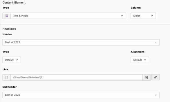 Der Header Slider steht nur auf der Startseite zur Verfügung. Dort können im Bereich “Slider” “Text Media Elemente” eingefügt werden. In den Elementen werden Bilder, Text und Links verwaltet, die dann im Slider entsprechend ausgelesen werden.